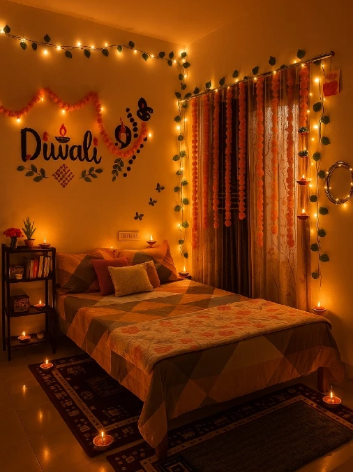 Warm bulbs intertwined with green leaf vines further illuminate the wall surface. This combination turns a dark bedroom into a radiant space filled with festive energy.