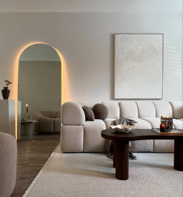 An arched mirror with built in lighting provides a soft halo effect against a plain wall. This glow illuminates the surrounding area and adds depth to a room with few windows.