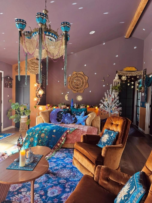 Celestial accents like suns and moons sparkle under the warm bulbs. This whimsical lighting choice ensures every corner of the room feels magical and bright.