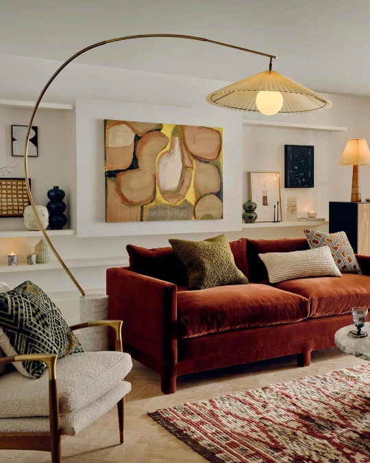 A dramatic brass floor lamp with a wide reach brings focused light directly over a seating area. This setup provides plenty of illumination for reading in a room with minimal natural sun.