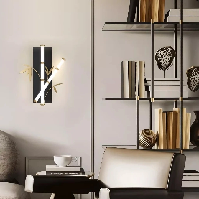 A modern wall light shaped like glowing bamboo shoots provides a unique focal point. This fixture casts a bright and steady light against neutral walls to eliminate dark spots.