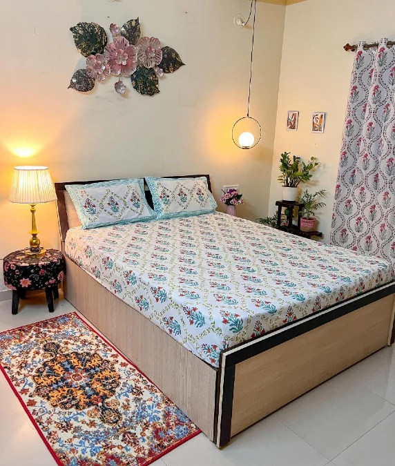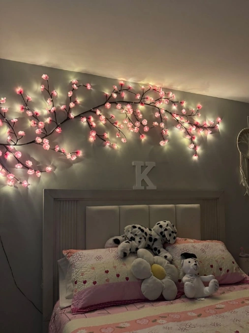 Tiny bulbs tucked inside each flower petals cast a gentle radiance over the headboard. This creative lighting solution adds both warmth and a touch of nature to a dim interior.