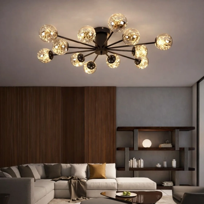 A central ceiling fixture with multiple glass globes spreads light into every corner of a large living area. This design ensures that even rooms with high ceilings and dark wood paneling stay bright.