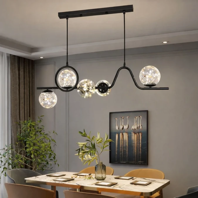A sleek black frame holds five glass globes filled with tiny twinkling lights. These spheres follow a wavy rod to spread brightness across the dining area.