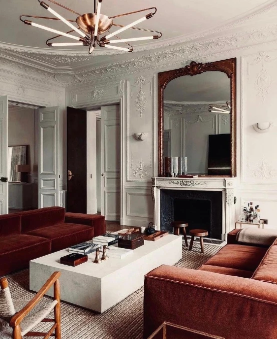 Positioning a mirror above the fireplace creates a strong focal point. It draws the eye upward and highlights the beautiful molding on the ceiling.
