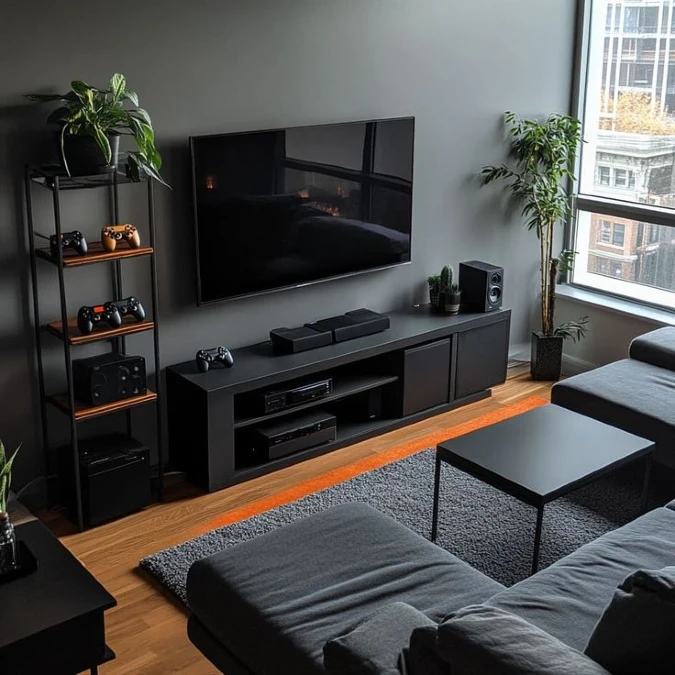 Long surfaces offer plenty of room for speakers and small potted plants. This setup balances entertainment needs with a clean and organized aesthetic.