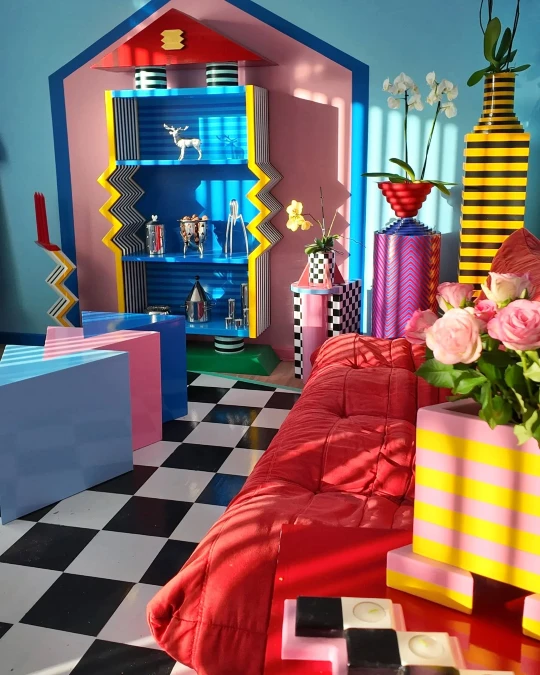 Checkered floors provide a classic contrast to the neon blue and pink accents. Fresh flowers in striped vases bring a touch of nature to this eclectic room.