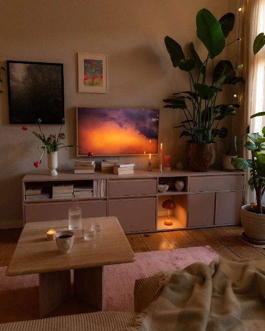 Tall leafy plants stand next to the media unit to add organic texture. Stashed books and simple framed art pieces make the rental feel lived in.