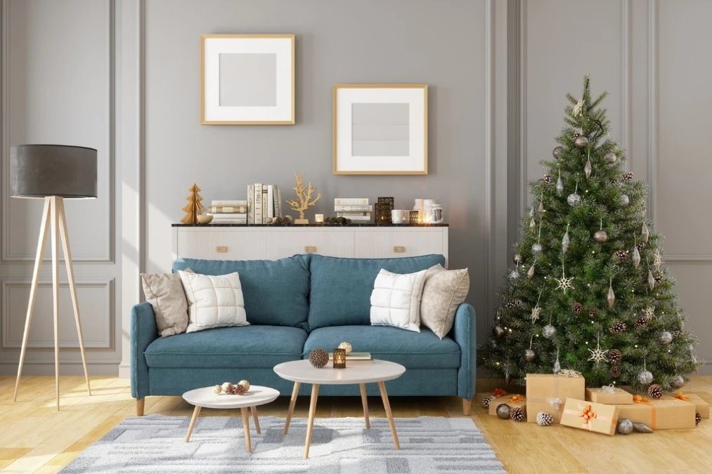 A tall evergreen tree brings a festive spirit to the living room corner. Sparkling silver ornaments and warm white lights add a joyful touch.