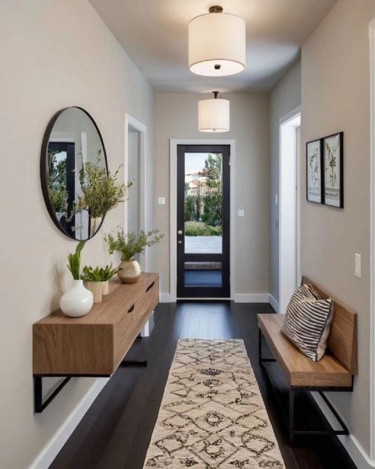 Floating wooden consoles save floor space while providing a sleek surface for greenery. A large round mirror reflects light to make narrow corridors feel much wider.