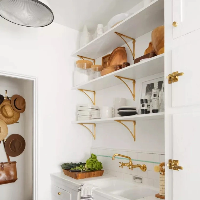 Gold brackets support white floating shelves to keep kitchen essentials within easy reach. This vertical storage solution displays ceramic plates and wooden bowls as functional decor.