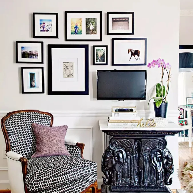 Black frames in various sizes create a personalized display of photography and art. This arrangement surrounds a small television to blend technology with decor.