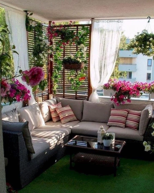 Vibrant pink flowers and lush climbing vines transform a small outdoor space into a private oasis. Wooden trellis panels provide support for hanging baskets and shield the area from neighbors.