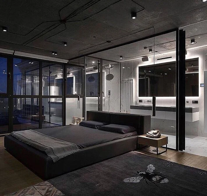 Glass partitions separate the bath suite while maintaining an open floor plan. A large moth graphic on the area rug provides a striking artistic focal point.