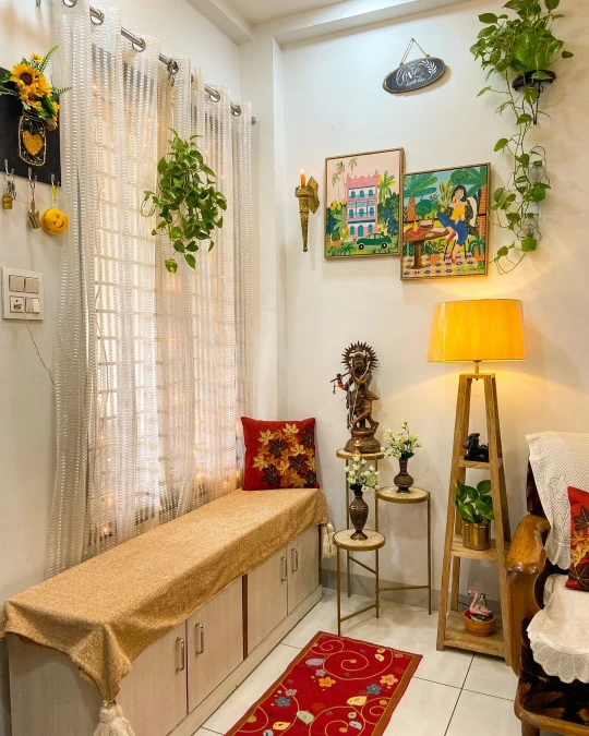 Colorful art pieces and a red geometric stool add bold focal points. A cozy white armchair provides a serene spot amidst the lush greenery.