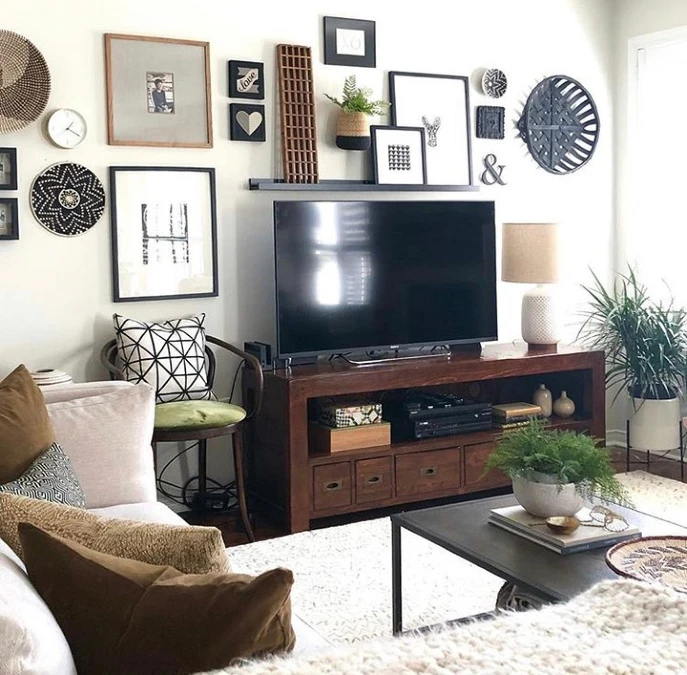• Curated Gallery Walls: Surround the television with a structured arrangement of artwork and photographs to balance the focal point and distract the eye.