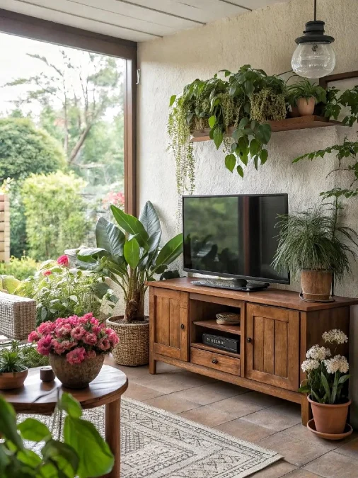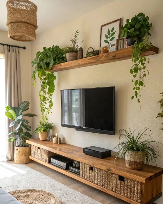Plants surround the television in this bright room. A high shelf holds trailing greenery that hangs down near the screen. Large leaves in woven baskets stand on the floor to fill the corner space.