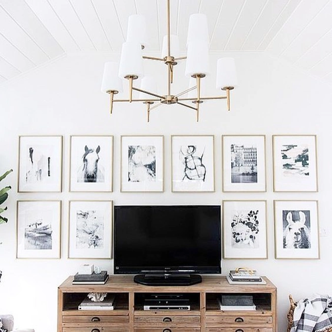 Matching gold frames create a strict grid around the screen. Monochromatic art prints blend well with the dark glass. The precise layout makes the television look intentional within the display.