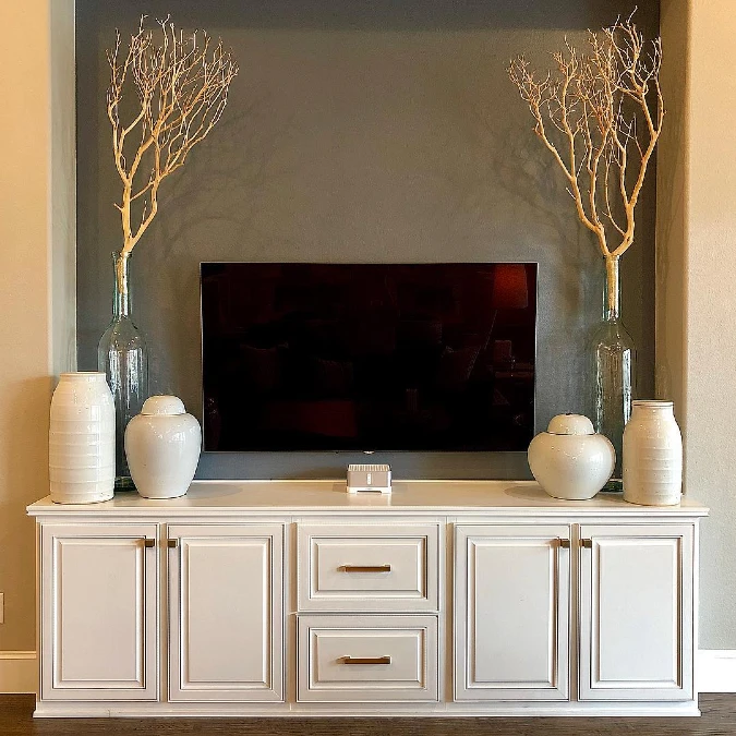 White ceramic jars sit on the console to anchor the arrangement. The dark gray paint behind the electronics helps camouflage the black rectangle. A white cabinet provides contrast and brightens the lower section.
