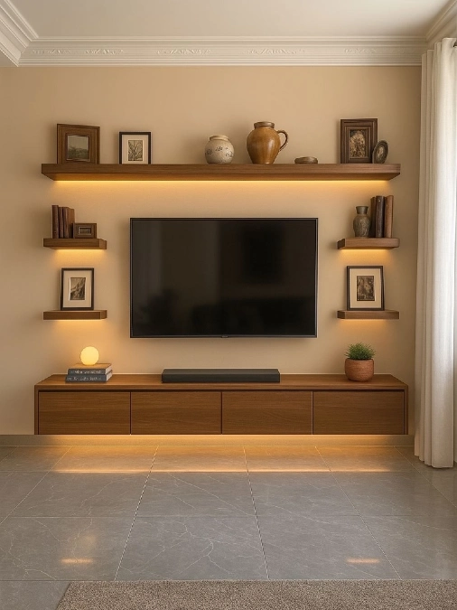 Warm LED strips glow beneath the wooden shelves to create ambiance. This soft lighting highlights the clean lines of the floating unit. Small framed art and pottery sit on the side ledges to frame the television. The symmetrical layout looks balanced and calm.