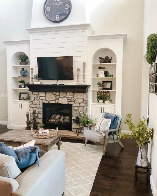 A stone fireplace serves as the main focal point with a television mounted on the shiplap. Tall arched built-ins flank the hearth to provide symmetrical storage. A large vintage clock hangs high above the screen to fill the wall space. The white paint brightens the room and contrasts with the textured rock.