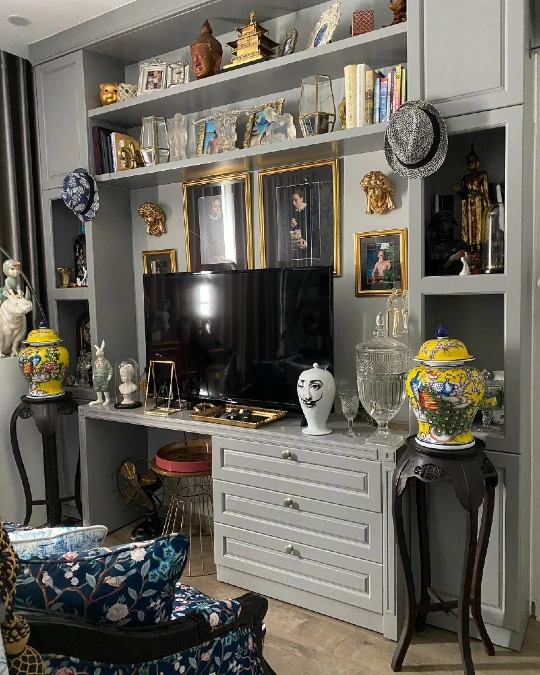 Floor to ceiling grey shelves surround the television with a bold collection of decor. Gold frames and statues add shine against the matte painted wood. Bright yellow ginger jars flank the screen to create symmetry. This busy display reflects a unique personality.