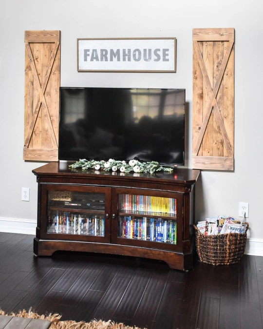 Tall wooden shutters stand on each side of the television. These reclaimed panels add texture to the plain gray wall. A simple sign hangs above the screen to define the room’s style. The wood tones warm up the cool paint color.