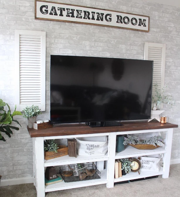 A large wooden sign hangs above the television to declare the room’s purpose. The text “Gathering Room” centers the design on the faux brick wall. White shutter panels flank the screen to add texture without overwhelming the space.