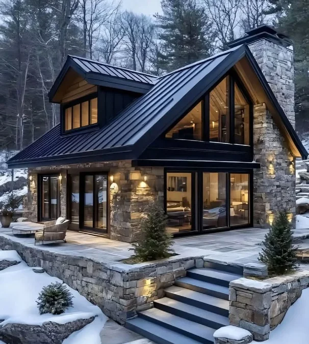 This image shows a spectacular modern tiny house nestled in a snowy, wooded landscape. The structure combines natural stone siding with a dark metal roof and expansive black framed windows. A large A frame window highlights the upper living area.
