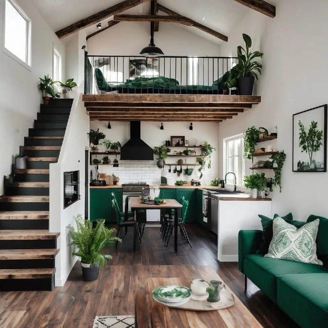 This bright tiny house interior features a striking contrast between vibrant green elements and crisp white walls. A large black staircase with exposed wood treads leads up to an expansive, airy sleeping loft. The high ceiling has exposed wooden beams adding rustic charm.