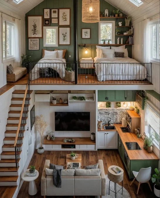 Below the lofts, the design includes a small living room with a neutral sofa and a functional kitchen. The kitchen boasts green and white cabinetry, wood countertops, and modern appliances. Natural light streams in through multiple windows and two skylights.