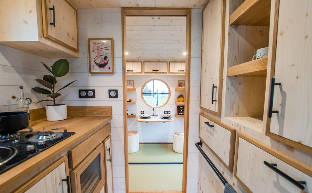 This tiny house features an ultra efficient galley kitchen made of light wood cabinetry and countertops. Black handles and fixtures provide a simple, modern contrast against the light wood. Open shelving and closed cabinets maximize vertical storage space.