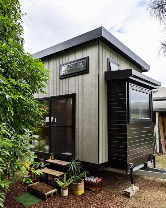 The entrance is accessed by simple wooden steps placed over concrete blocks. Lush green plants and shrubs surround the base of the home, which rests on wood chips. This structure effectively combines minimalist style with mobility.