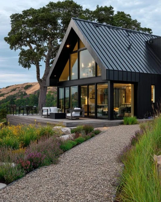 This home features a striking matte black metal exterior with a deep gabled roofline. Full height glass walls wrap around the corner to showcase a glowing modern kitchen and living area.