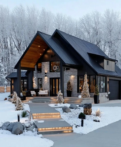 This modern home combines light grey stone walls with sharp black metal siding. A large peaked roof overhang features warm wood paneling and integrated spotlights to brighten the porch.