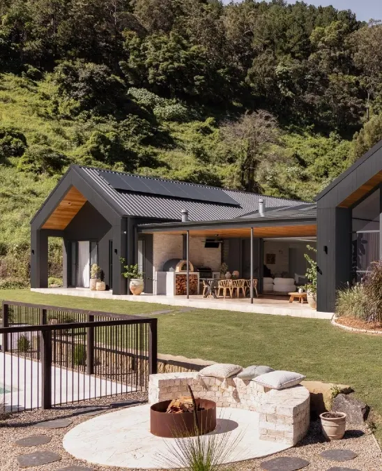 This low profile home features a dark metal exterior that blends into the green hillside. Solar panels line the gabled roof to capture natural energy from the sun. A deep porch with a wooden ceiling covers a built-in outdoor kitchen and pizza oven.