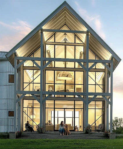 This home features a massive glass front held by a sturdy white timber frame. Exposed metal ductwork and a large dome pendant light highlight the industrial interior style. The adjacent corrugated metal silo adds a unique agricultural touch to the modern living space.