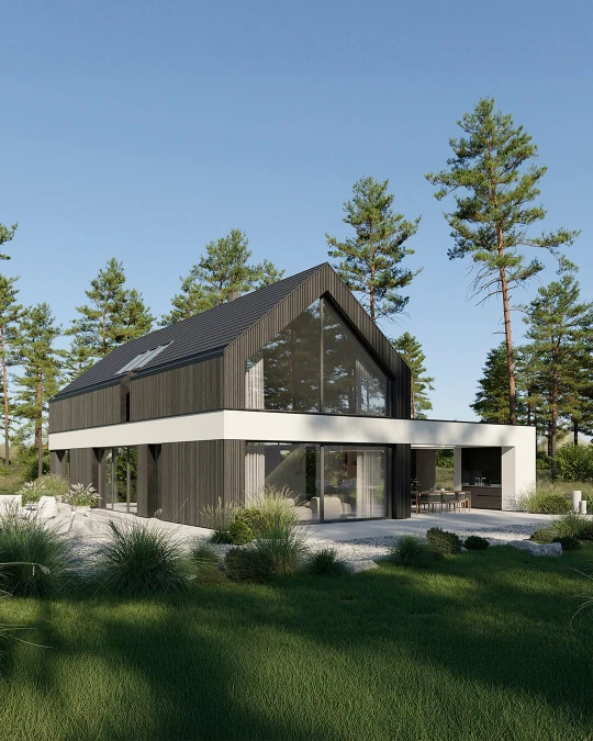 This residence features a sharp gabled roof and vertical charcoal siding for a sleek appearance. A white horizontal band wraps around the middle to create a bold architectural division.