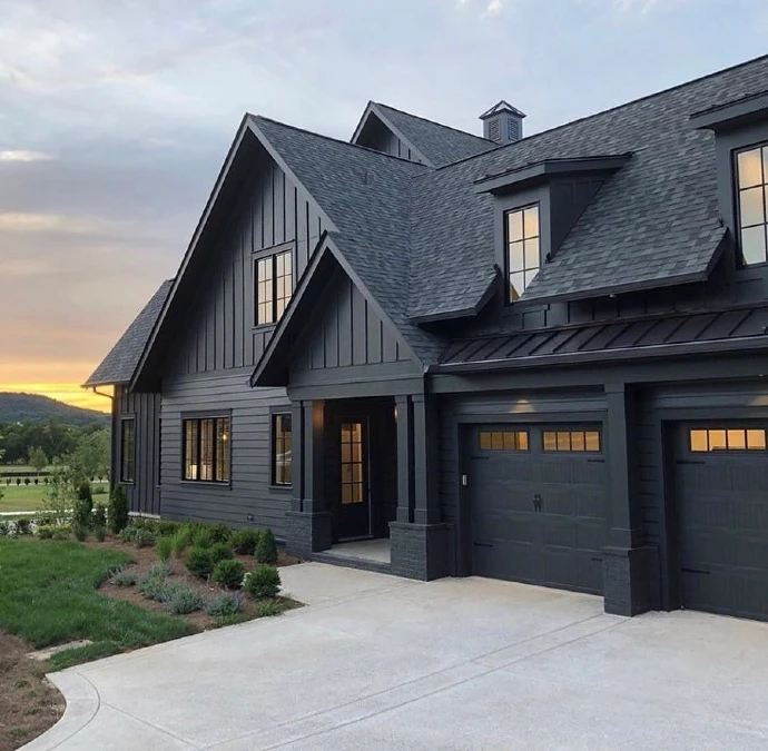 This home showcases a deep charcoal palette with vertical and horizontal siding for a textured effect. Multiple gabled peaks and a prominent dormer window create a classic barn house silhouette.