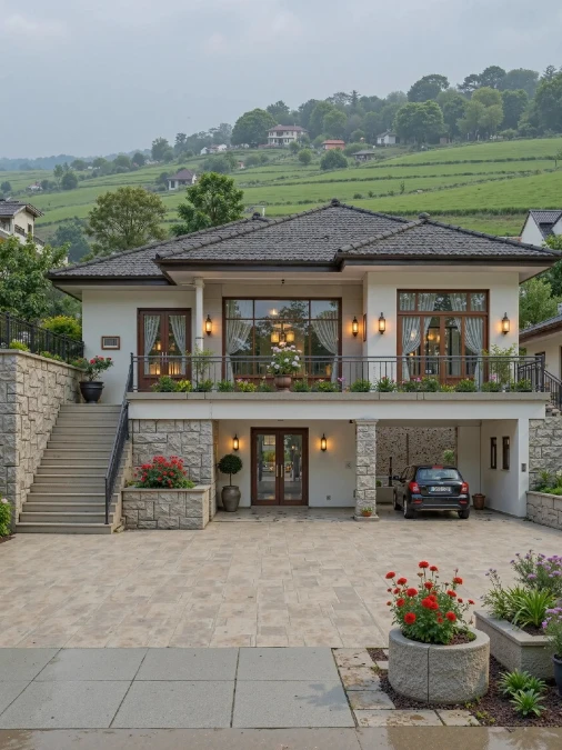 This design features a wide upper balcony that stretches across the front facade. Stone cladding on the lower pillars and retaining walls adds organic texture to the structure.
