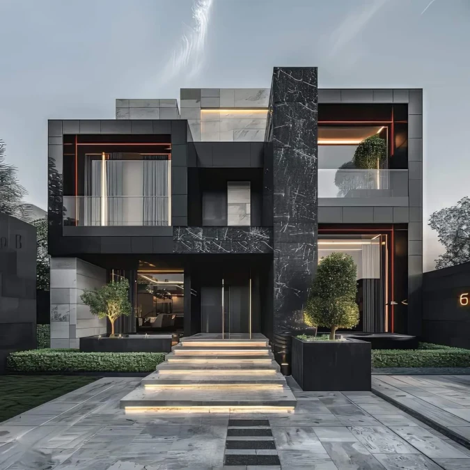 This residence uses dark marble slabs to create a bold and sophisticated look. Sharp rectangular volumes stack together to form a unique architectural silhouette.