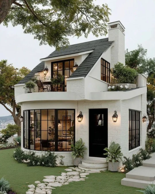 This charming home features a rounded front wall with large grid windows. White brick siding provides a clean and timeless texture to the small footprint.