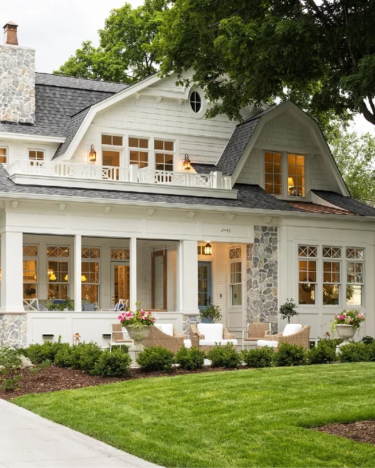 This elegant home features a gambrel roof with dark gray shingles and crisp white siding. A spacious stone patio in the foreground offers a comfortable seating area with wicker chairs and plush cushions.