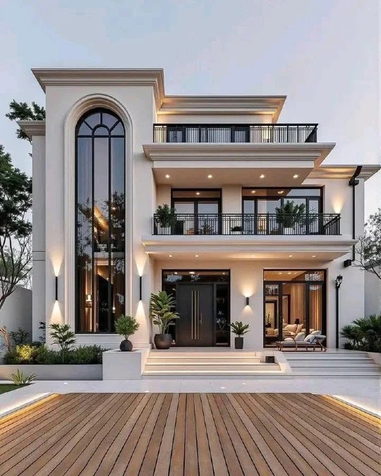 A stunning arched window stretches across two stories to define this elegant cream facade. Black metal railings on multiple balconies provide a sharp contrast against the light exterior walls.