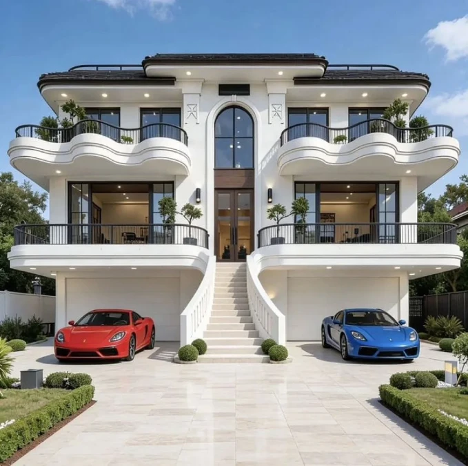 This white mansion showcases a central grand staircase that splits to reveal two garage bays below. Identical wavy balconies on the upper floors create a sense of movement and architectural symmetry.