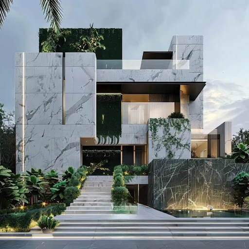 This ultra modern home features massive white marble slabs with gray veining. Vertical strips of lush green moss and climbing vines break up the cold stone surfaces.