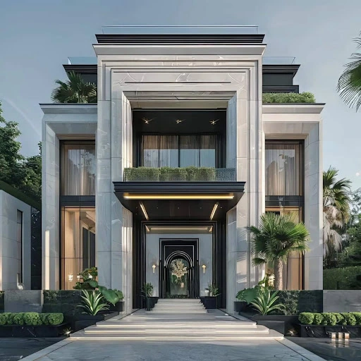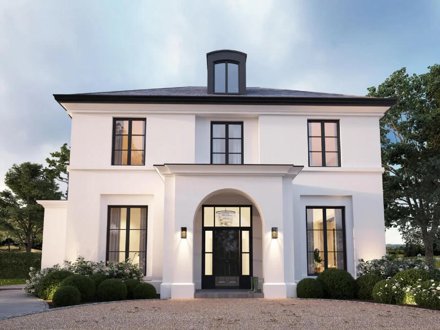 Dark trim on the roofline and window frames provides a sharp contrast against the pale walls. Small manicured hedges line the wide tiled driveway to complete the luxurious look.