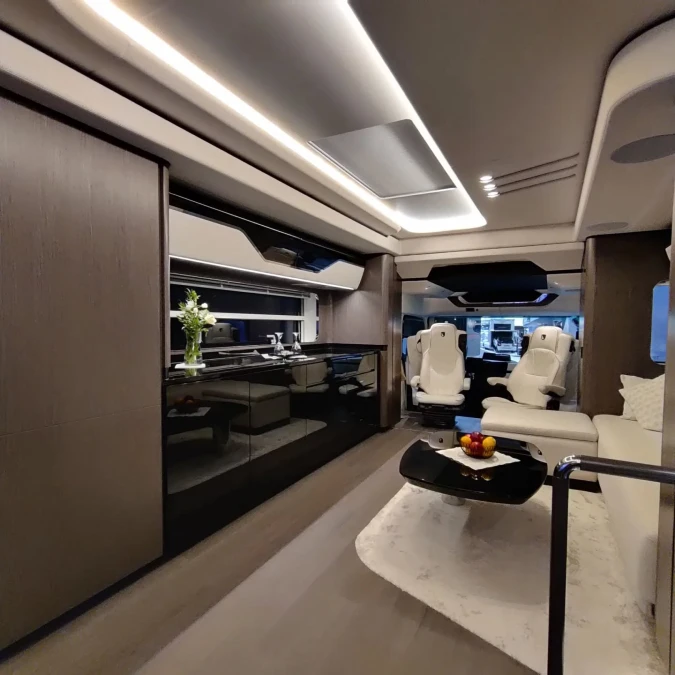 White leather captain chairs and a plush sofa offer premium seating for long trips. A sleek coffee table sits on a soft rug to provide a sophisticated spot for snacks.