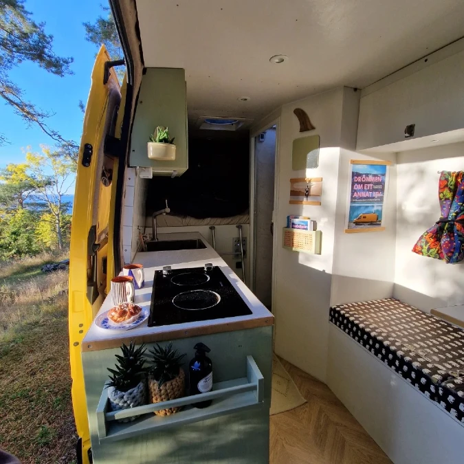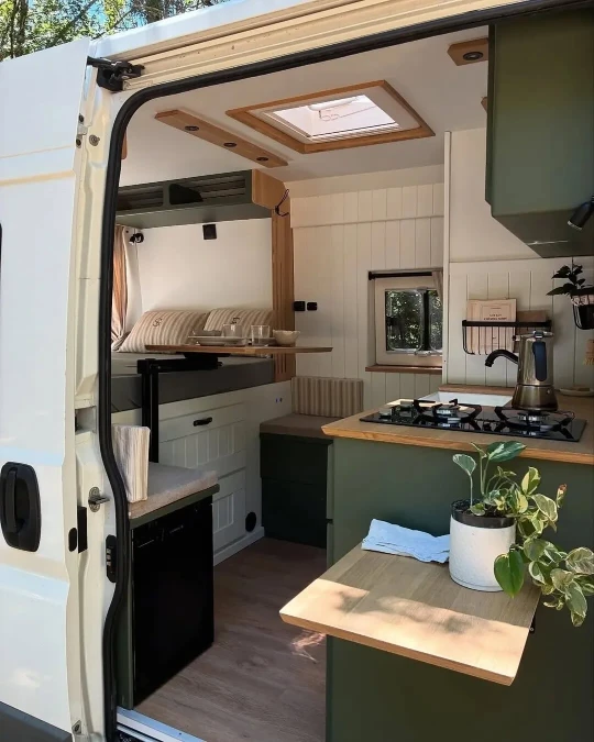 Striped pillows rest on a comfortable bed tucked into the rear of the van. Natural light pours through the rooftop skylight to brighten the cozy cooking zone.