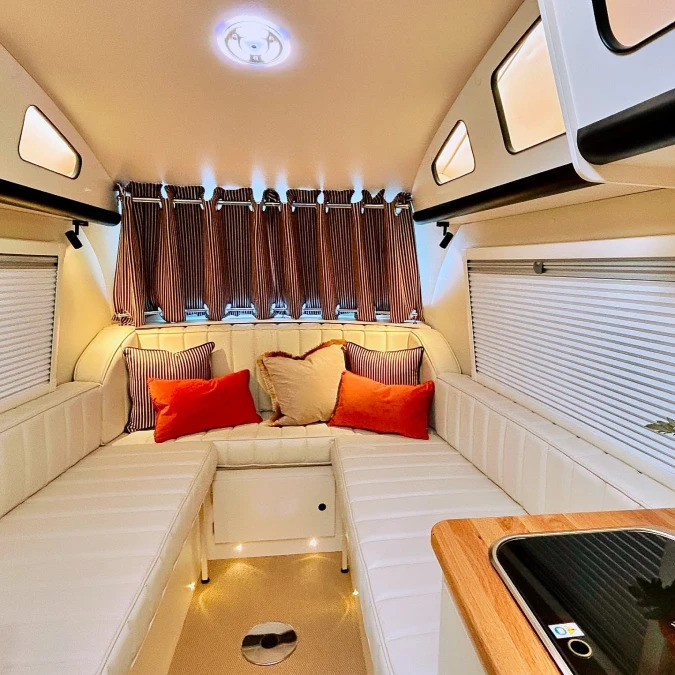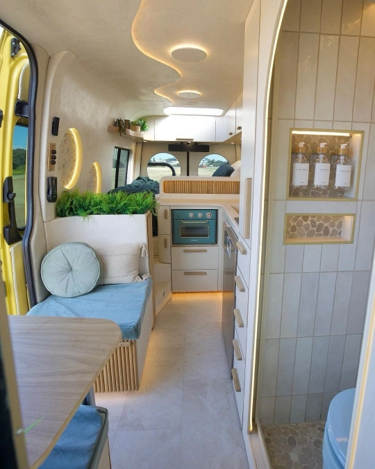 Soft pillows and warm blankets turn the rear seating area into a peaceful sanctuary. Trailing green plants bring life to the white walls while golden lights glow overhead.